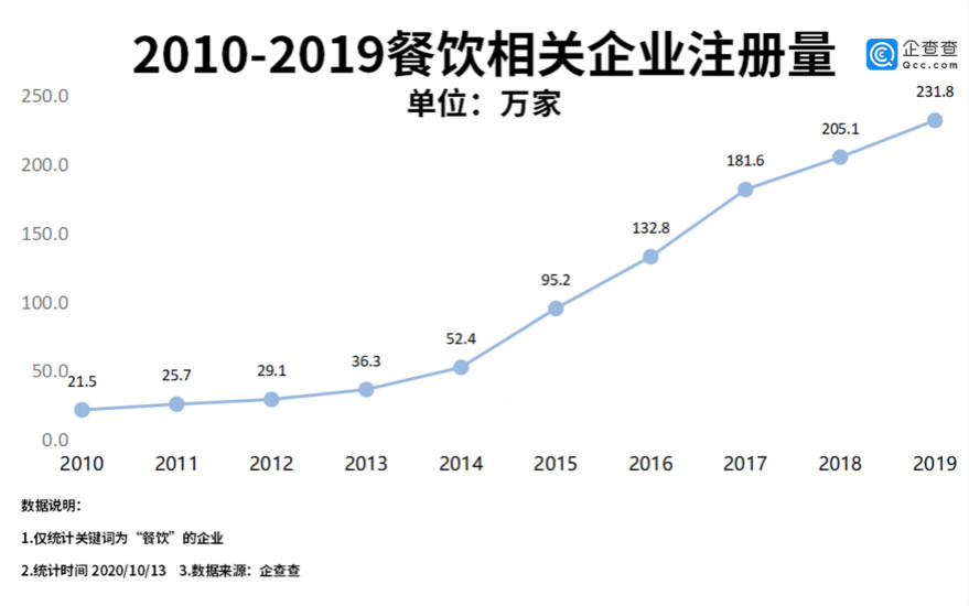 從企業(yè)發(fā)展情況來看,企查查數(shù)據(jù)顯示,過去十年,我國餐飲相關的企業(yè)注冊量從2014年開始加速增長,2015-2019年一共新注冊了846.4萬家餐飲相關的企業(yè),2019年的注冊量是231.8萬家,相比十年前——2010年的注冊量(21.5萬家)增長了9.8倍。